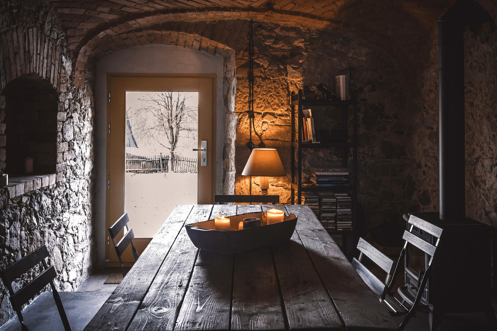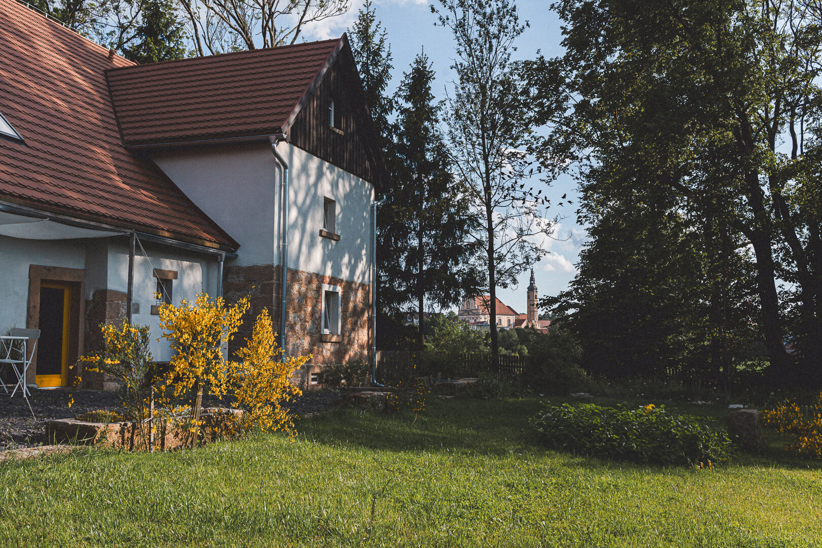 Przytulny pokój ze ścianą ryglową. Jego wystrój tworzą starannie dobrane meble, dodatki, oraz obrazy naszych przyjaciół. Z okien Rotundy roztacza się piękny widok na stary sad.